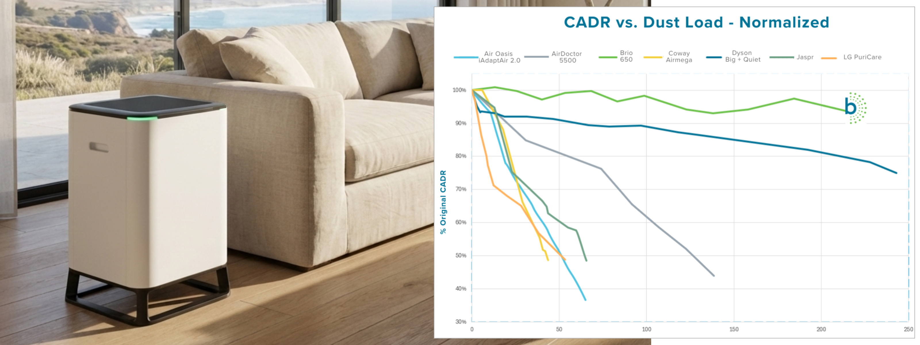 Brio will remove airborne dust in your home or office. Brio works without filter clogging, so your airflow stays high and more dust, dander, pollen and other PM2.5 can be removed. Testing shows Brio collects 60 grams of dust while remaining at 90% of the original clean air delivery rate. HEPA purifiers can't match that.