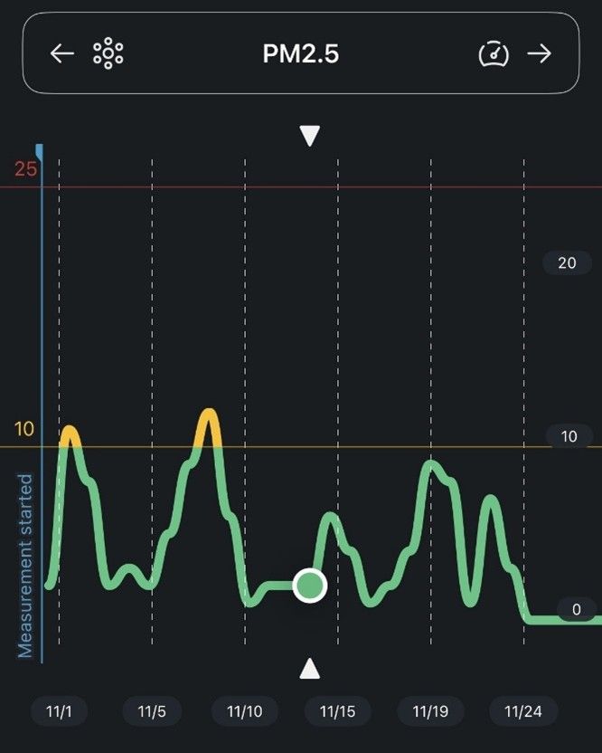 We suggest using a separate device as particle sensors and air quality monitors located onboard an air purifier may give a less accurate picture of the true levels of pollution in the room, since the air closest to the purifier will tend to be cleaner. In addition, they can go out of calibration leading to inaccurate readings.